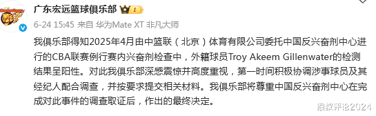 广东宏远官方回应表示:外籍球员Troy Akeem Gillenwater的检测结果呈阳性。对此我俱乐部深感震惊并高度重视,第一时间积极协调涉事球员及其经纪人配合调查,并按要求提交相关材料。我俱乐部将尊重中国反兴奋剂中心在完成对此事件的调查取证后,作出的最终决定。
